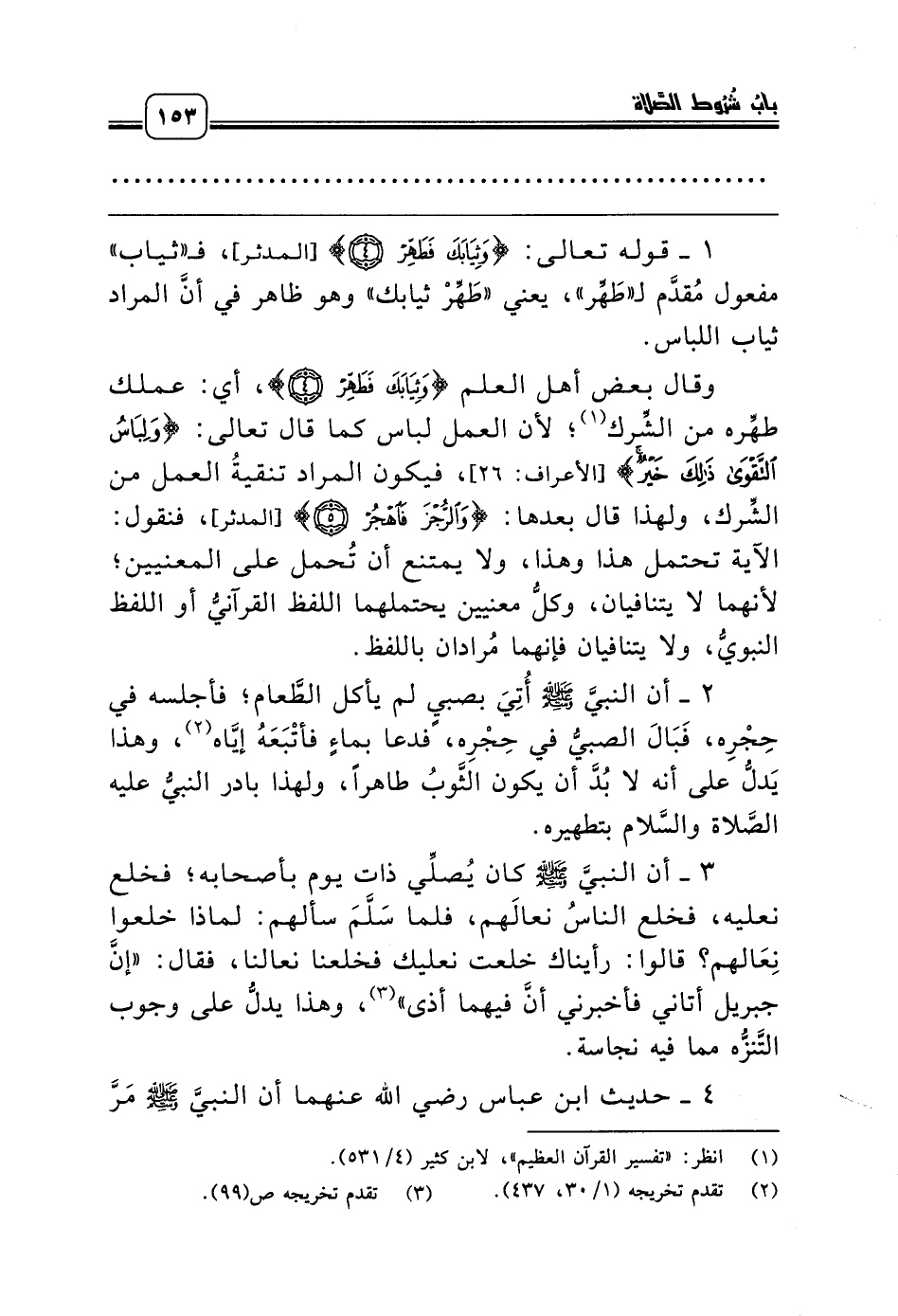 1 - قوله تعالى: {وَثِيَابَكَ فَطَهِّرْ *} [المدثر]، فـ «ثياب» مفعول مُقدَّم لـ «طَهِّر»، يعني «طَهِّرْ ثيابك» وهو ظاهر في أنَّ المراد ثياب اللباس.