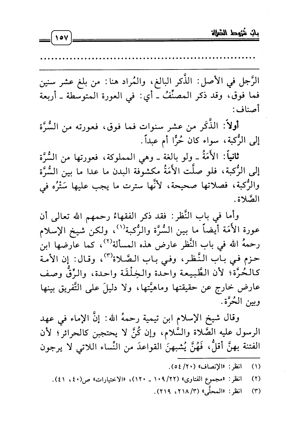 وأما في باب النَّظر: فقد ذكر الفقهاءُ رحمهم الله تعالى أن عورة الأَمَة أيضاً ما بين السُّرَّة والرُّكبة (¬1)، ولكن شيخ الإسلام رحمه الله في باب النَّظر عارض هذه المسألة (¬2)، كما عارضها ابن حزم في باب النَّظر، وفي باب الصَّلاة (¬3)، وقال: إن الأمة كالحُرَّة؛ لأن الطَّبيعة واحدة والخِلْقَة واحدة، والرِّقُّ وصف عارض خارج عن حقيقتها وماهيَّتها، ولا دليلَ على التَّفريق بينها وبين الحُرَّة.