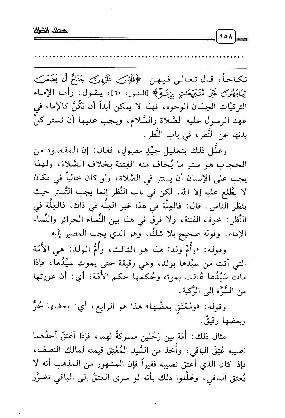 وعلَّل ذلك بتعليل جيِّدٍ مقبولٍ، فقال: إن المقصود من الحجاب هو ستر ما يُخاف منه الفِتنة بخلاف الصَّلاة، ولهذا يجب على الإنسان أن يستتر في الصَّلاة، ولو كان خالياً في مكان لا يطَّلع عليه إلا الله. لكن في باب النَّظر إنما يجب التَّستر حيث ينظر الناس. قال: فالعِلَّة في هذا غير العِلَّة في ذاك، فالعِلَّة في النَّظر: خوف الفتنة، ولا فرق في هذا بين النِّساء الحرائر والنِّساء الإماء. وقوله صحيح بلا شكٍّ، وهو الذي يجب المصير إليه.