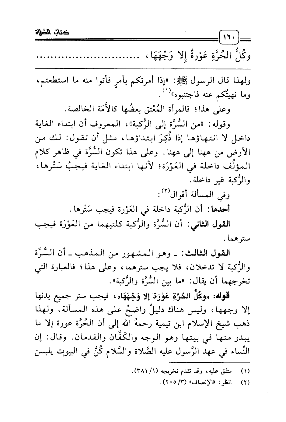 قوله: «وكُلُّ الحُرَّةِ عَوْرَة إلا وَجْهَهَا»، فيجب ستر جميع بدنها إلا وجهها، وليس هناك دليلٌ واضحٌ على هذه المسألة، ولهذا ذهب شيخ الإسلام ابن تيمية رحمه الله إلى أن الحُرَّة عورة إلا ما يبدو منها في بيتها وهو الوجه والكَفَّان والقدمان. وقال: إن النِّساء في عهد الرَّسول عليه الصَّلاة والسَّلام كُنَّ في البيوت يلبسن