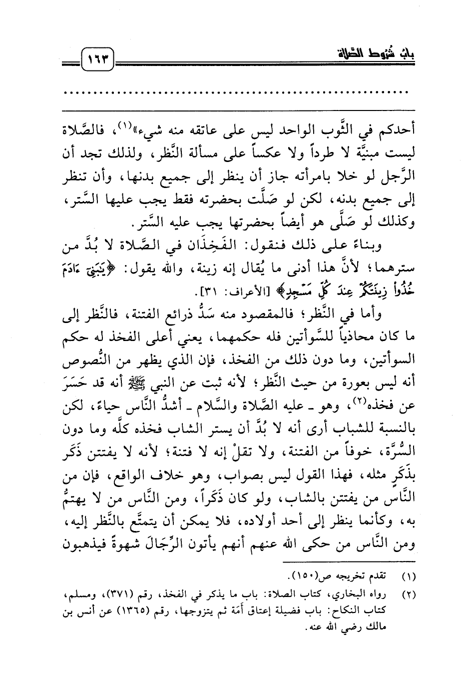 وبناءً على ذلك فنقول: الفَخِذَان في الصَّلاة لا بُدَّ من سترهما؛ لأنَّ هذا أدنى ما يُقال إنه زينة، والله يقول: {يَابَنِي آدَمَ خُذُوا زِينَتَكُمْ عِنْدَ كُلِّ مَسْجِدٍ} [الأعراف: 31] .....