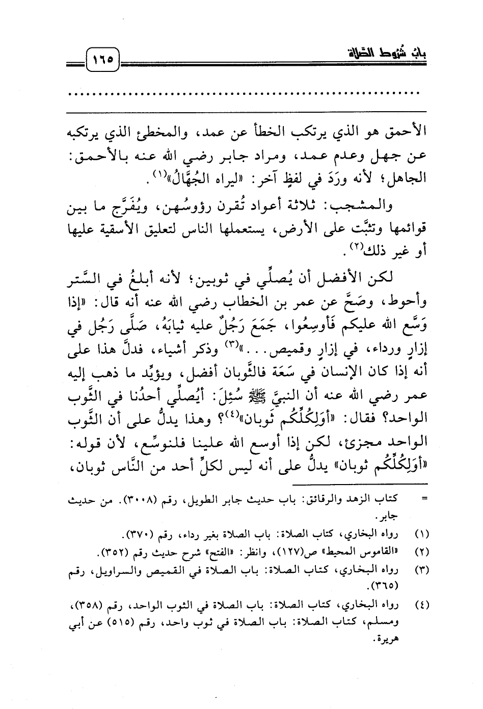 (¬4) رواه البخاري، كتاب الصلاة: باب الصلاة في الثوب الواحد، رقم (358)، ومسلم، كتاب الصلاة: باب الصلاة في ثوب واحد، رقم (515) عن أبي هريرة.
