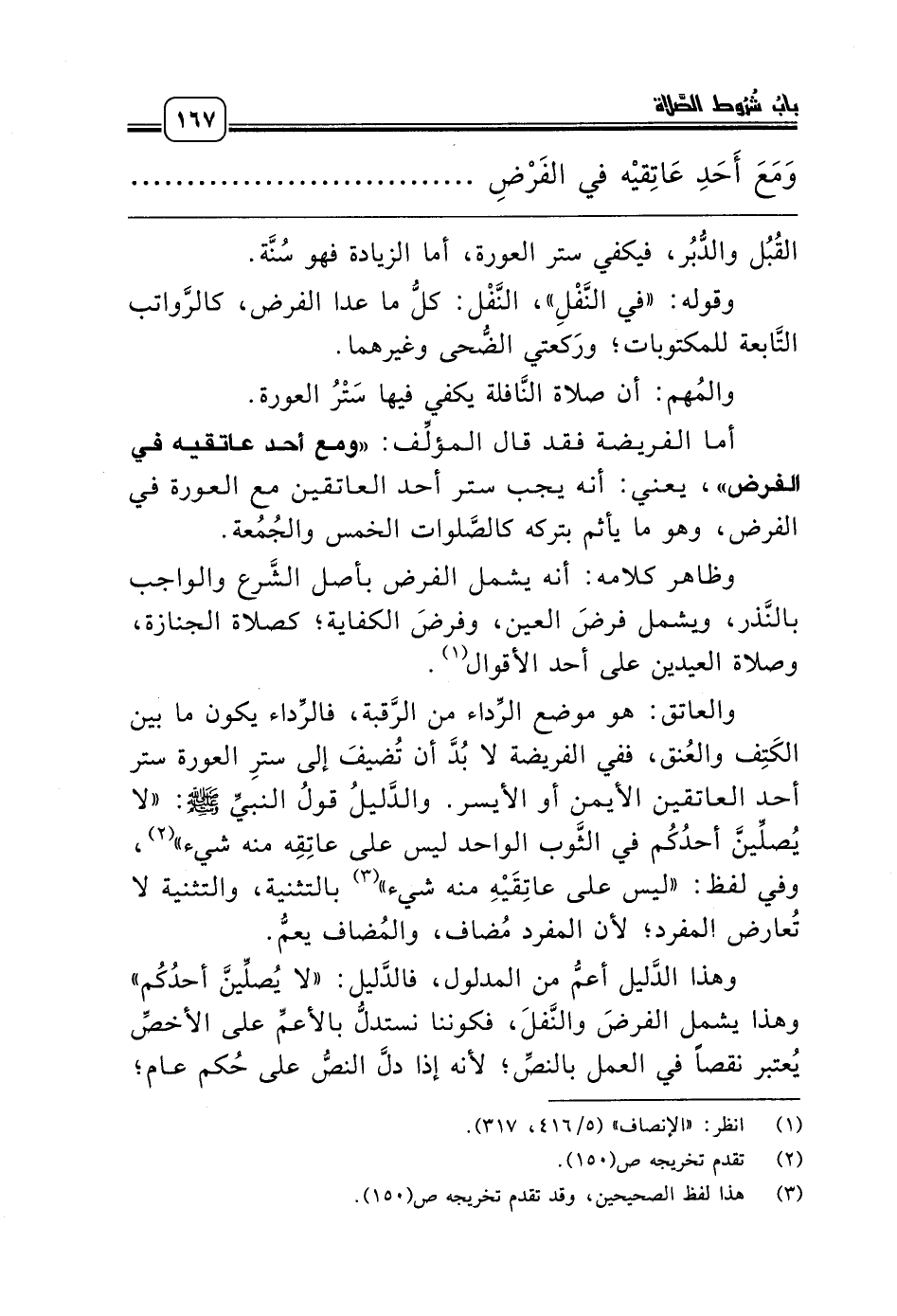 والعاتق: هو موضع الرِّداء من الرَّقبة، فالرِّداء يكون ما بين الكَتِف والعُنق، ففي الفريضة لا بُدَّ أن تُضيفَ إلى سترِ العورة ستر أحد العاتقين الأيمن أو الأيسر. والدَّليلُ قولُ النبيِّ صلّى الله عليه وسلّم: «لا يُصلِّينَّ أحدُكُم في الثَّوب الواحد ليس على عاتِقِه منه شيء» (¬2)، وفي لفظ: «ليس على عاتِقَيْهِ منه شيء» (¬3) بالتثنية، والتثنية لا تُعارض المفرد؛ لأن المفرد مُضاف، والمُضاف يعمُّ.