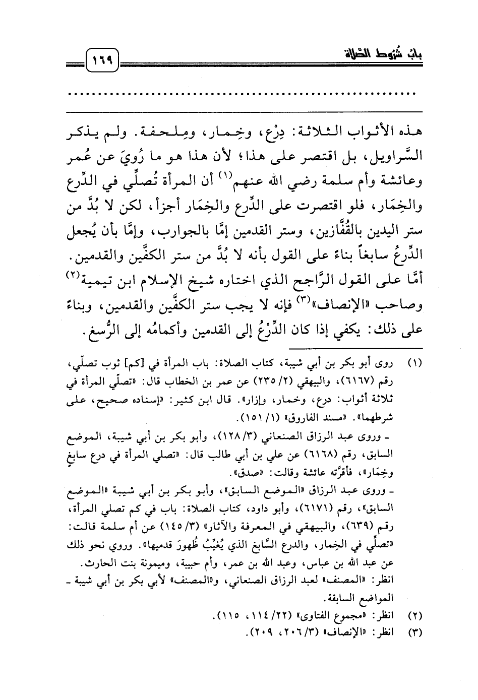 هذه الأثواب الثلاثة: دِرْع، وخِمار، ومِلحفة. ولم يذكر السَّراويل، بل اقتصر على هذا؛ لأن هذا هو ما رُويَ عن عُمر وعائشة وأم سلمة رضي الله عنهم (¬1) أن المرأة تُصلِّي في الدِّرع والخِمَار، فلو اقتصرت على الدِّرع والخِمَار أجزأ، لكن لا بُدَّ من ستر اليدين بالقُفَّازين، وستر القدمين إمَّا بالجوارب، وإمَّا بأن يُجعل الدِّرعُ سابغاً بناءً على القول بأنه لا بُدَّ من ستر الكفَّين والقدمين. أمَّا على القول الرَّاجح الذي اختاره شيخ الإسلام ابن تيمية (¬2) وصاحب «الإنصاف» (¬3) فإنه لا يجب ستر الكفَّين والقدمين، وبناءً على ذلك: يكفي إذا كان الدِّرْعُ إلى القدمين وأكمامُه إلى الرُّسغ.