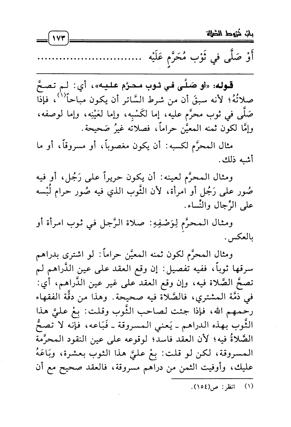 ومثال المحرَّم لكون ثمنه المعيَّن حراماً: لو اشترى بدراهم سرقها ثوباً، ففيه تفصيل: إن وقع العقد على عين الدَّراهم لم تصحَّ الصَّلاة فيه، وإن وقع العقد على غير عين الدَّراهم، أي: في ذمَّة المشتري، فالصَّلاة فيه صحيحة. وهذا من دقَّة الفقهاء رحمهم الله، فإذا جئت لصاحب الثَّوب وقلت: بِعْ عليَّ هذا الثَّوب بهذه الدراهم ـ يَعني المسروقة ـ فَبَاعه، فإنه لا تصحُّ الصَّلاةُ فيه؛ لأن العقد فاسد؛ لوقوعه على عين النقود المحرَّمة المسروقة، لكن لو قلت: بِعْ عليَّ هذا الثوب بعشرة، وبَاعَهُ عليك، وأوفيت الثمن من دراهم مسروقة، فالعقد صحيح مع أن
