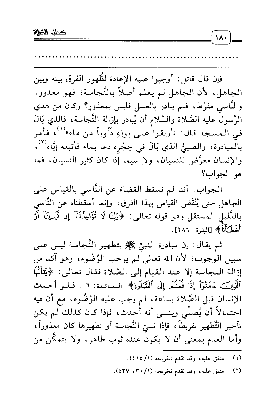 فإن قال قائل: أوجبوا عليه الإعادة لظُهور الفرق بينه وبين الجاهل، لأن الجاهل لم يعلم أصلاً بالنَّجاسة؛ فهو معذور، والنَّاسي مفرِّط، فلم يبادر بالغسل فليس بمعذور؟ وكان من هدي الرَّسول عليه الصَّلاة والسَّلام أن يُبادر بإزالة النَّجاسة، فالذي بَالَ في المسجد قال: «أريقوا على بولِهِ ذَنُوباً من ماء» (¬1)، فأمر بالمبادرة، والصبيُّ الذي بَالَ في حِجْرِه دعا بماء فأتبعه إيَّاه (¬2)، والإنسان معرَّض للنسيان، ولا سيما إذا كان كثير النسيان، فما هو الجواب؟