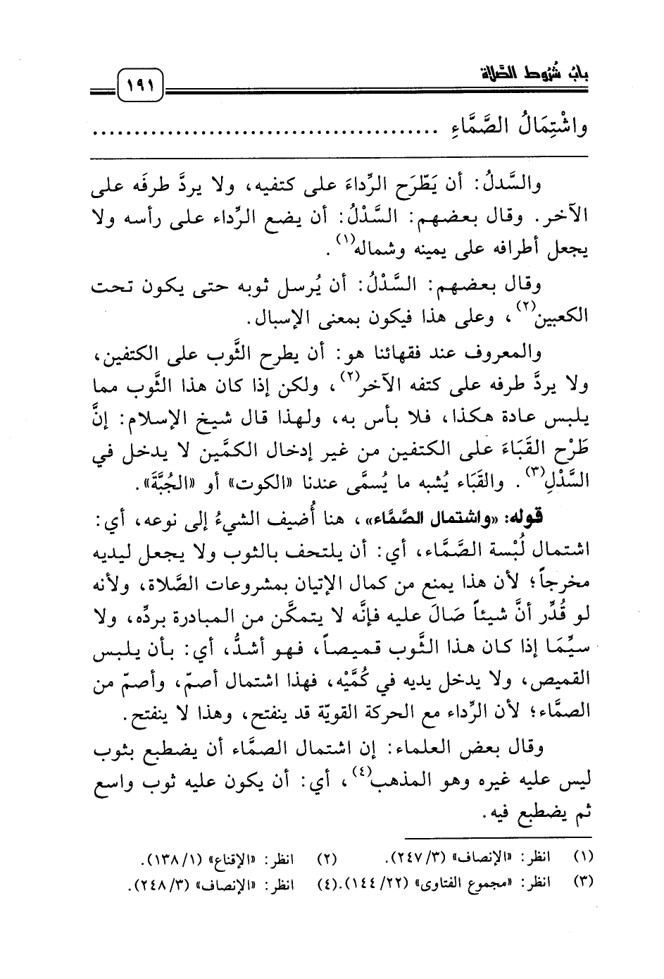 قوله: «واشتمال الصَّمَّاء»، هنا أُضيف الشيءُ إلى نوعه، أي: اشتمال لُبْسة الصَّمَّاء، أي: أن يلتحف بالثوب ولا يجعل ليديه مخرجاً؛ لأن هذا يمنع من كمال الإتيان بمشروعات الصَّلاة، ولأنه لو قُدِّر أنَّ شيئاً صَالَ عليه فإنَّه لا يتمكَّن من المبادرة بردِّه، ولا سيِّمَا إذا كان هذا الثَّوب قميصاً، فهو أشدُّ، أي: بأن يلبس القميص، ولا يدخل يديه في كُمَّيْه، فهذا اشتمال أصمّ، وأصمّ من الصمَّاء؛ لأن الرِّداء مع الحركة القويّة قد ينفتح، وهذا لا ينفتح.