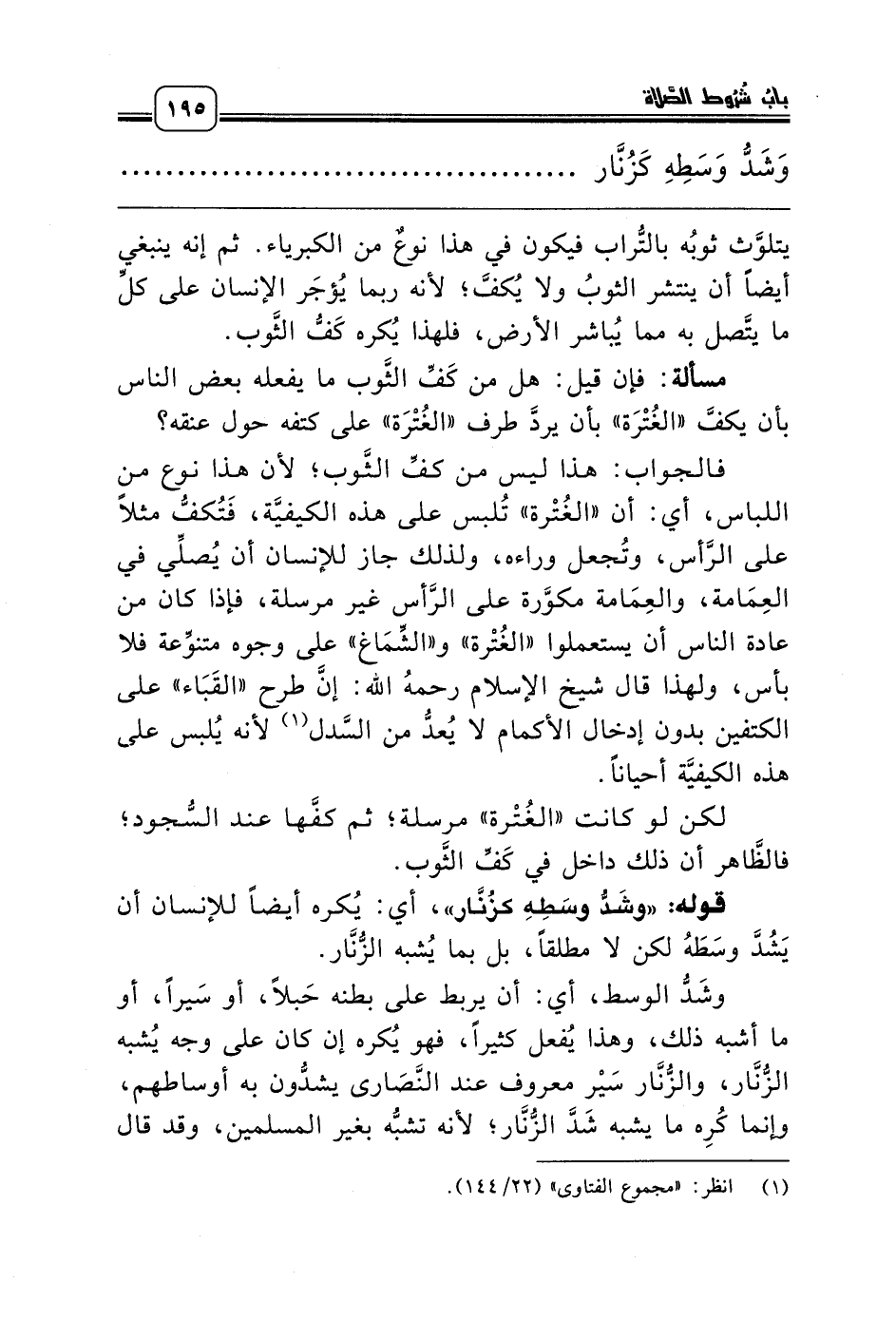 فالجواب: هذا ليس من كفِّ الثَّوب؛ لأن هذا نوع من اللباس، أي: أن «الغُتْرة» تُلبس على هذه الكيفيَّة، فَتُكفُّ مثلاً على الرَّأس، وتُجعل وراءه، ولذلك جاز للإنسان أن يُصلِّي في العِمَامة، والعِمَامة مكوَّرة على الرَّأس غير مرسلة، فإذا كان من عادة الناس أن يستعملوا «الغُتْرة» و «الشِّمَاغ» على وجوه متنوِّعة فلا بأس، ولهذا قال شيخ الإسلام رحمه الله: إنَّ طرح «القَبَاء» على الكتفين بدون إدخال الأكمام لا يُعدُّ من السَّدل (¬1) لأنه يُلبس على هذه الكيفيَّة أحياناً.