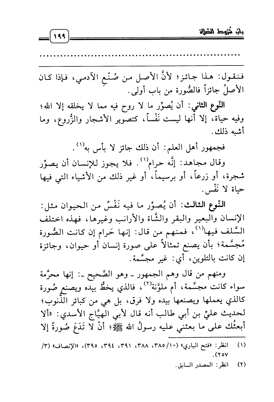 النَّوع الثالث: أن يُصوِّر ما فيه نَفْسٌ من الحيوان مثل: الإنسان والبعير والبقر والشَّاة والأرانب وغيرها، فهذه اختلف السَّلف فيها (381)، فمنهم من قال: إنها حَرام إن كانت الصُّورة مُجسَّمة؛ بأن يصنع تمثالاً على صورة إنسان أو حيوان، وجائزة إن كانت بالتلوين، أي: غير مجسَّمة.