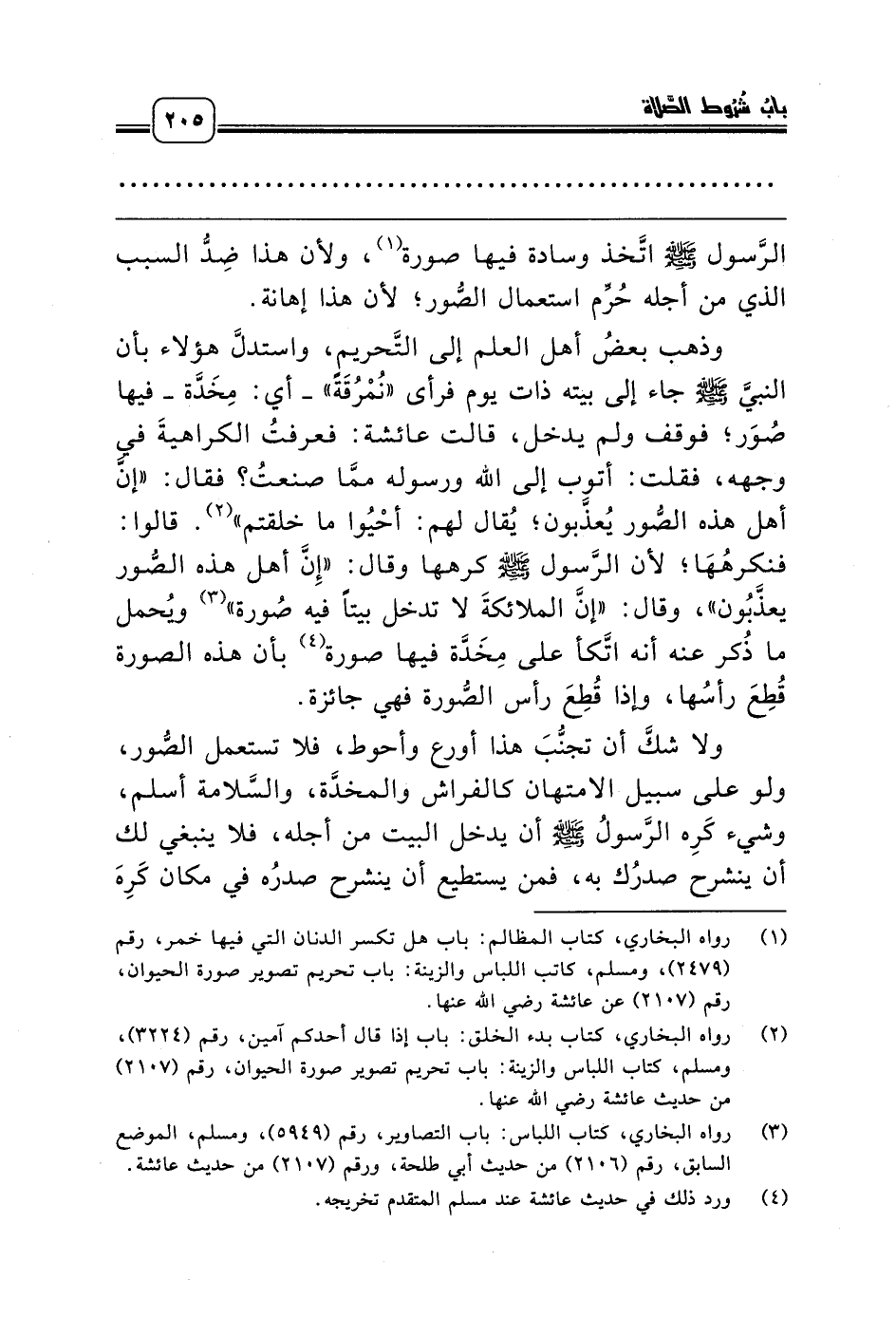 (¬1) رواه البخاري، كتاب المظالم: باب هل تكسر الدنان التي فيها خمر، رقم (2479)، ومسلم، كاتب اللباس والزينة: باب تحريم تصوير صورة الحيوان، رقم (2107) عن عائشة رضي الله عنها.