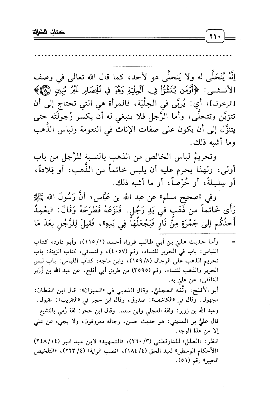 وفي «صحيح مسلم» عن عبد الله بن عَبَّاس؛ أنَّ رَسُولَ الله صلّى الله عليه وسلّم رَأَى خَاتماً من ذَهَبٍ في يَدِ رَجُلٍ. فَنَزَعَهُ فَطَرَحَهُ وَقَالَ: «يعْمِدُ أَحدُكُم إلى جَمْرَةٍ مِنْ نَارٍ فَيَجْعَلُهَا فِي يَدِهِ»، فَقيلَ لِلرَّجُلِ بعَدَ مَا