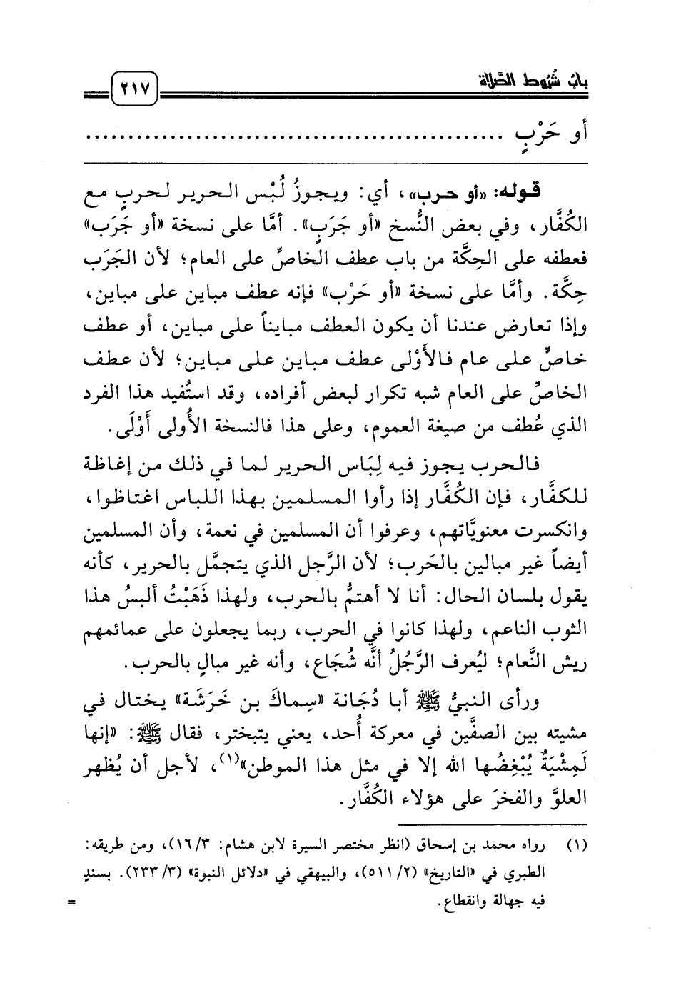 قوله: «أو حرب»، أي: ويجوزُ لُبْس الحرير لحربٍ مع الكُفَّار، وفي بعض النُّسخ «أو جَرَبٍ». أمَّا على نسخة «أو جَرَب» فعطفه على الحِكَّة من باب عطف الخاصِّ على العام؛ لأن الجَرَب حِكَّة. وأمَّا على نسخة «أو حَرْب» فإنه عطف مباين على مباين، وإذا تعارض عندنا أن يكون العطف مبايناً على مباين، أو عطف خاصٍّ على عام فالأَوْلى عطف مباين على مباين؛ لأن عطف الخاصِّ على العام شبه تكرار لبعض أفراده، وقد استُفيد هذا الفرد الذي عُطف من صيغة العموم، وعلى هذا فالنسخة الأُولى أَوْلَى.