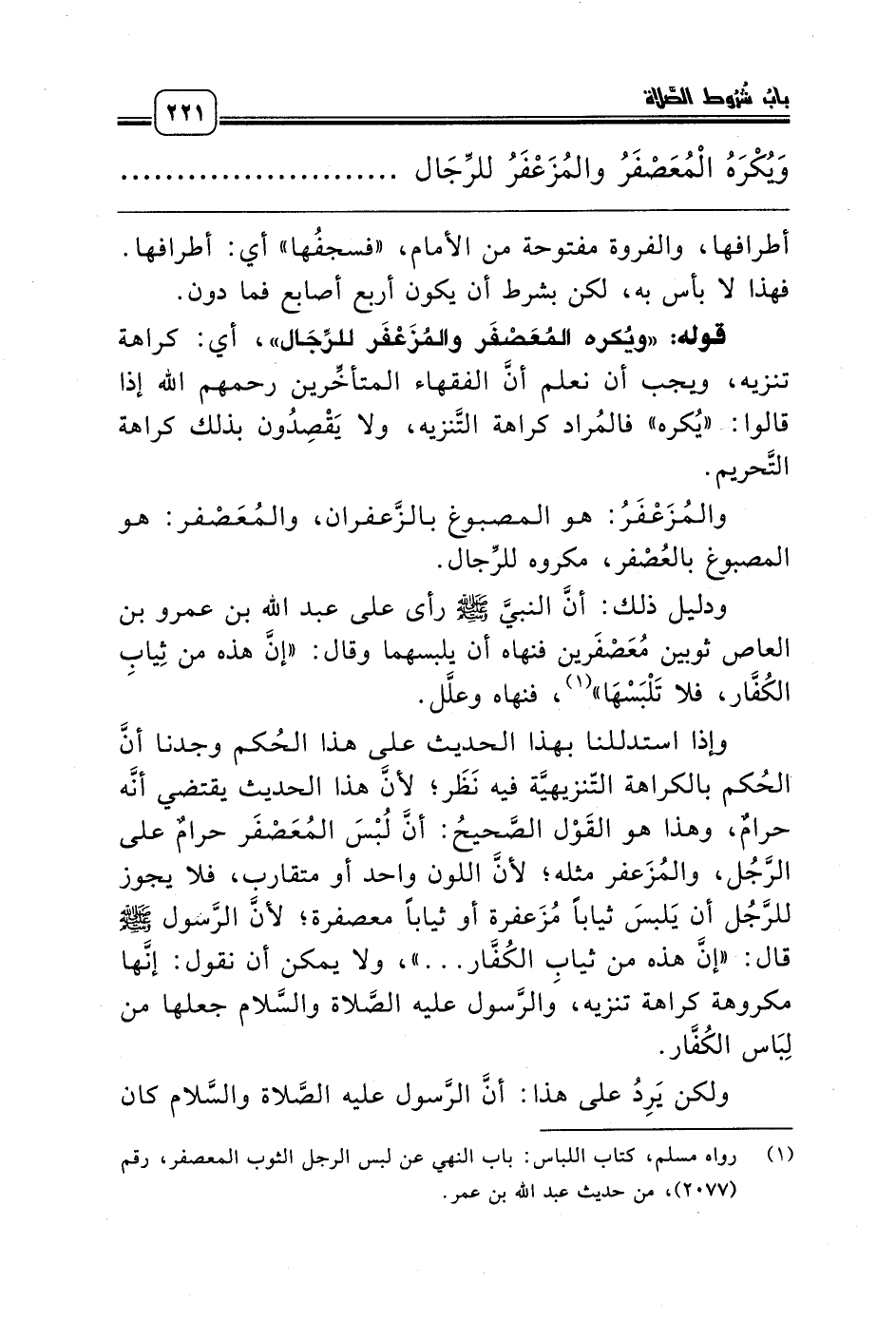 وإذا استدللنا بهذا الحديث على هذا الحُكم وجدنا أنَّ الحُكم بالكراهة التّنزيهيَّة فيه نَظَر؛ لأنَّ هذا الحديث يقتضي أنَّه حرامٌ، وهذا هو القَوْل الصَّحيحُ: أنَّ لُبْسَ المُعَصْفَر حرامٌ على الرَّجُل، والمُزَعفر مثله؛ لأنَّ اللون واحد أو متقارب، فلا يجوز للرَّجُل أن يَلبسَ ثياباً مُزَعفرة أو ثياباً معصفرة؛ لأنَّ الرَّسول صلّى الله عليه وسلّم قال: «إنَّ هذه من ثيابِ الكُفَّار ... »، ولا يمكن أن نقول: إنَّها مكروهة كراهة تنزيه، والرَّسول عليه الصَّلاة والسَّلام جعلها من لِبَاس الكُفَّار.
