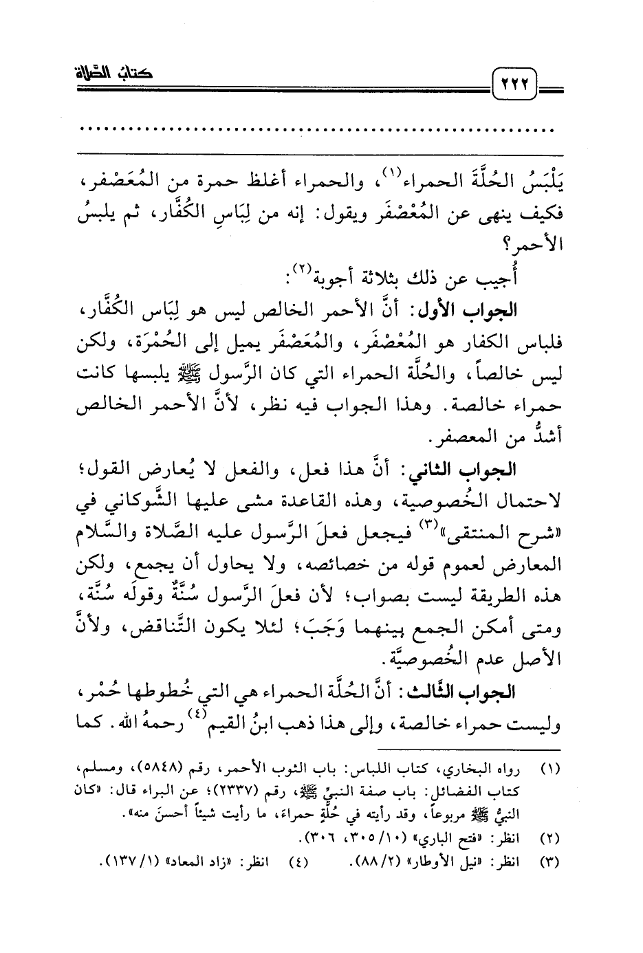الجواب الأول: أنَّ الأحمر الخالص ليس هو لِبَاس الكُفَّار، فلباس الكفار هو المُعْصْفَر، والمُعَصْفَر يميل إلى الحُمْرَة، ولكن ليس خالصاً، والحُلَّة الحمراء التي كان الرَّسول صلّى الله عليه وسلّم يلبسها كانت حمراء خالصة. وهذا الجواب فيه نظر، لأنَّ الأحمر الخالص أشدُّ من المعصفر.