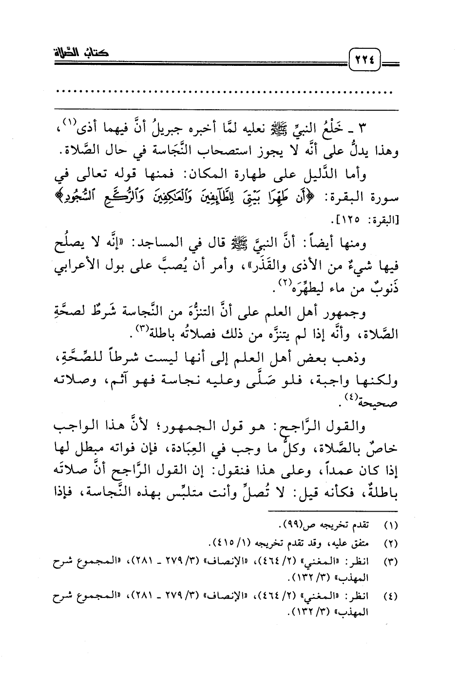 3 - خَلْعُ النبيِّ صلّى الله عليه وسلّم نعليه لمَّا أخبره جبريلُ أنَّ فيهما أذى (¬1)، وهذا يدلُّ على أنَّه لا يجوز استصحاب النَّجَاسة في حال الصَّلاة.