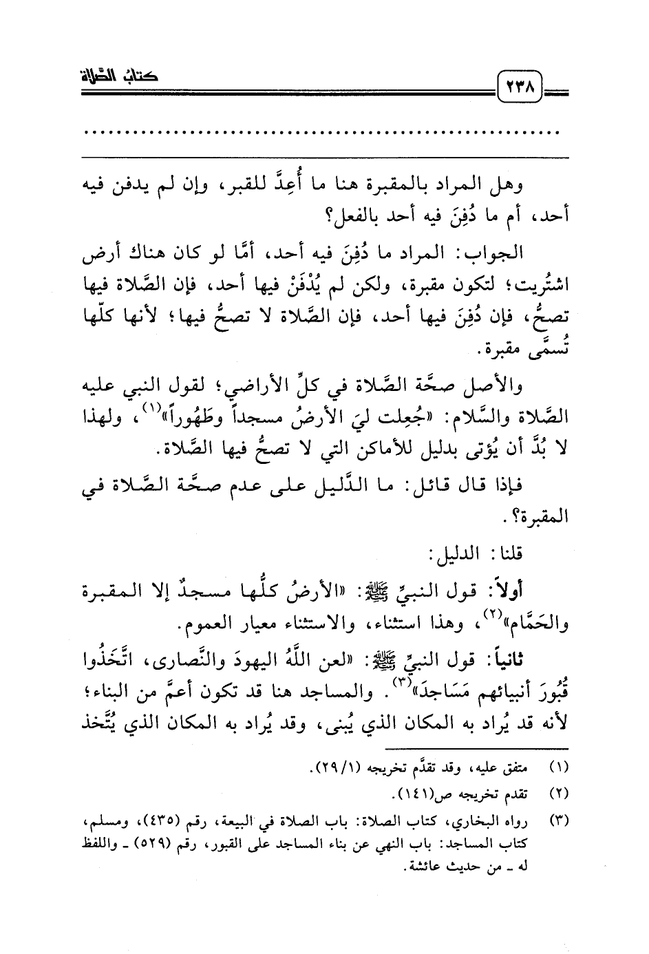 ثانياً: قول النبيِّ صلّى الله عليه وسلّم: «لعن اللَّهُ اليهودَ والنَّصارى، اتَّخَذُوا قُبُورَ أنبيائهم مَسَاجدَ» (¬3). والمساجد هنا قد تكون أعمَّ من البناء؛ لأنه قد يُراد به المكان الذي يُبنى، وقد يُراد به المكان الذي يُتَّخذ