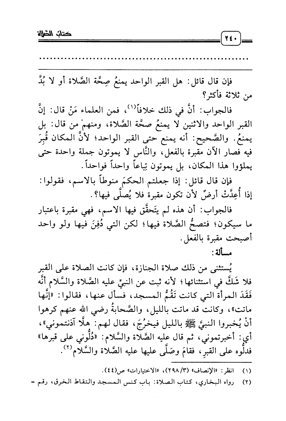 فإن قال قائل: هل القبر الواحد يمنعُ صِحَّة الصَّلاة أو لا بُدَّ من ثلاثة فأكثر؟