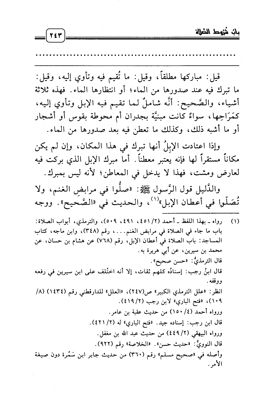 (¬1) رواه ـ بهذا اللفظ ـ أحمد (2/ 451، 491، 509)، والترمذي، أبواب الصلاة: باب ما جاء في الصلاة في مرابض الغنم ... ، رقم (348)، وابن ماجه، كتاب المساجد: باب الصلاة في أعطان الإبل، رقم (768) عن هشام بن حسان، عن محمد بن سيرين، عن أبي هريرة به.
