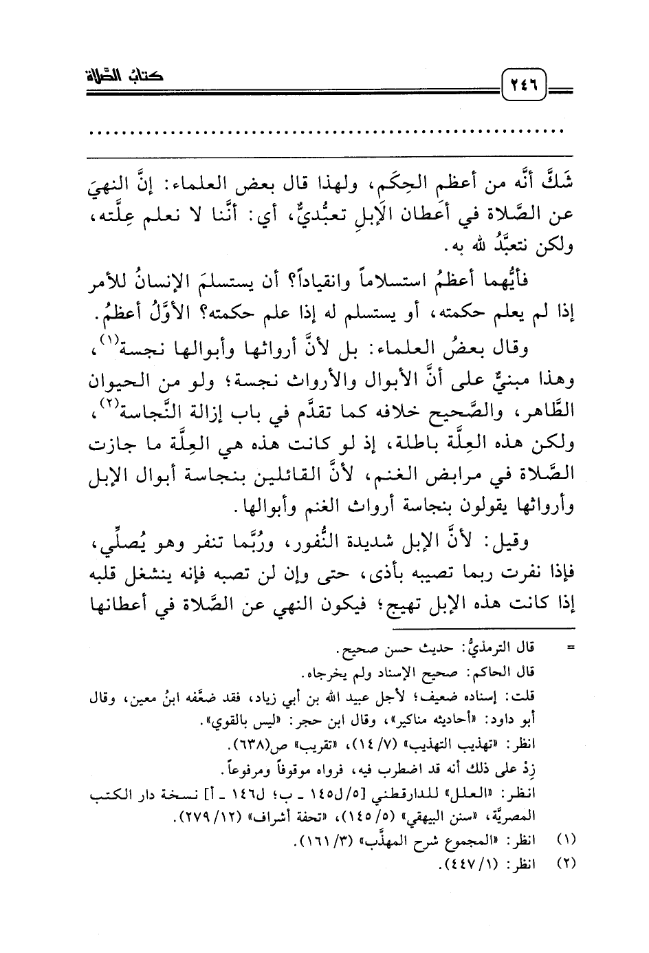 وقال بعضُ العلماء: بل لأنَّ أرواثها وأبوالها نجسة (¬1)، وهذا مبنيٌّ على أنَّ الأبوال والأرواث نجسة؛ ولو من الحيوان الطَّاهر، والصَّحيح خلافه كما تقدَّم في باب إزالة النَّجاسة (¬2)، ولكن هذه العِلَّة باطلة، إذ لو كانت هذه هي العِلَّة ما جازت الصَّلاة في مرابض الغنم، لأنَّ القائلين بنجاسة أبوال الإبل وأرواثها يقولون بنجاسة أرواث الغنم وأبوالها.