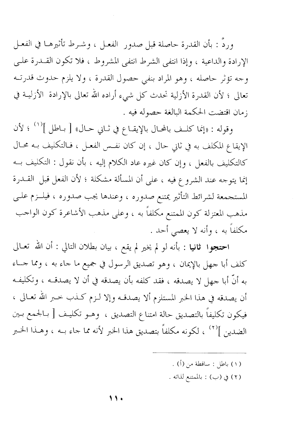 وقوله: «إنما كلف بالمحال بالإيقاع في ثاني حال» [باطل]؛ لأن الإيقاع المكلف به في ثاني حال, إن كان نفس الفعل, فالتكليف به محال كالتكليف بالفعل, وإن كان غيره عاد الكلام إليه, بأن نقول: التكليف به إنما يتوجه عند الشروع فيه, على أن المسألة مشكلة؛ لأن الفعل قبل القدرة المستجمعة لشرائط التأثير يمتنع صدوره, وعندها يجب صدوره, فيلزم على مذهب المعتزلة كون الممتنع مكلفًا به, وعلى مذهب الأشاعرة كون الواجب مكلفًا به, وأنه لا يعصي أحد.
