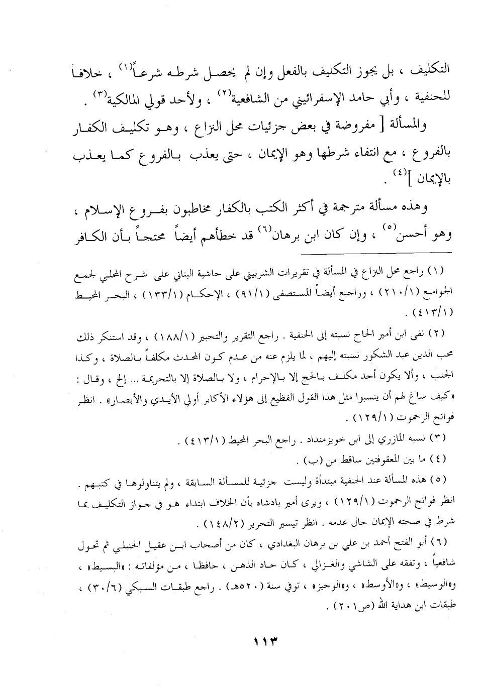 وهذه مسألة مترجمة في أكثر الكتب بالكفار مخاطبون بفروع الإسلام, وهو أحسن, وإن كان ابن برهان قد خطأهم أيضًا محتجًا بأن الكافر