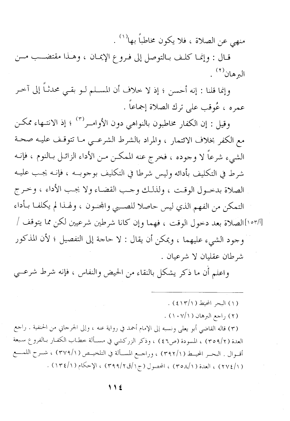 وقيل: إن الكفار مخاطبون بالنواهي دون الأوامر؛ إذ الانتهاء ممكن الشيء شرعًا لا وجوده, فخرج عنه الممكن من الأداء الزائل بالنوم, فإنه شرط في التكليف بأدائه وليس شرطا في التكليف بوجوبه, فإنه يجب عليه الصلاة بدخول الوقت, ولذلك وجب القضاء ولا يجب الأداء, وخرج التمكن من الفهم الذي ليس حاصلا للصبي والمجنون, ولهذا لم يكلفا بأداء الصلاة بعد دخول الوقت, فهما وإن كانا شرطين شرعيين لكن مما يتوقف / وجود الشيء عليهما, ويمكن أن يقال: لا حاجة إلى التفصيل؛ لأن المذكور شرطان عقليان لا شرعيان.