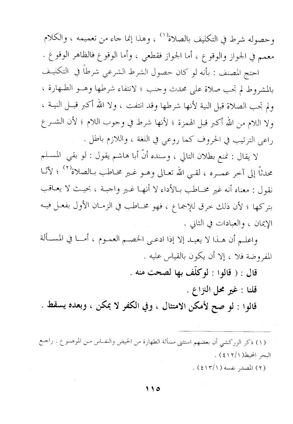 لا يقال: نمنع بطلان التالي, وسنده أنّ أبا هاشم يقول: لو بقي المسلم محدثًا إلى آخر عمره, لقي الله تعالى وهو غير مخاطب بالصلاة؛ لأّنا نقول: معناه أنه غير مخاطب بالأداء لا أنها غير واجبة, بحيث لا يعاقب بتركها؛ لأن ذلك خرق للإجماع, فهو مخاطب في الزمان الأول بفعل فيه الإيمان, والعبادات في الثاني.