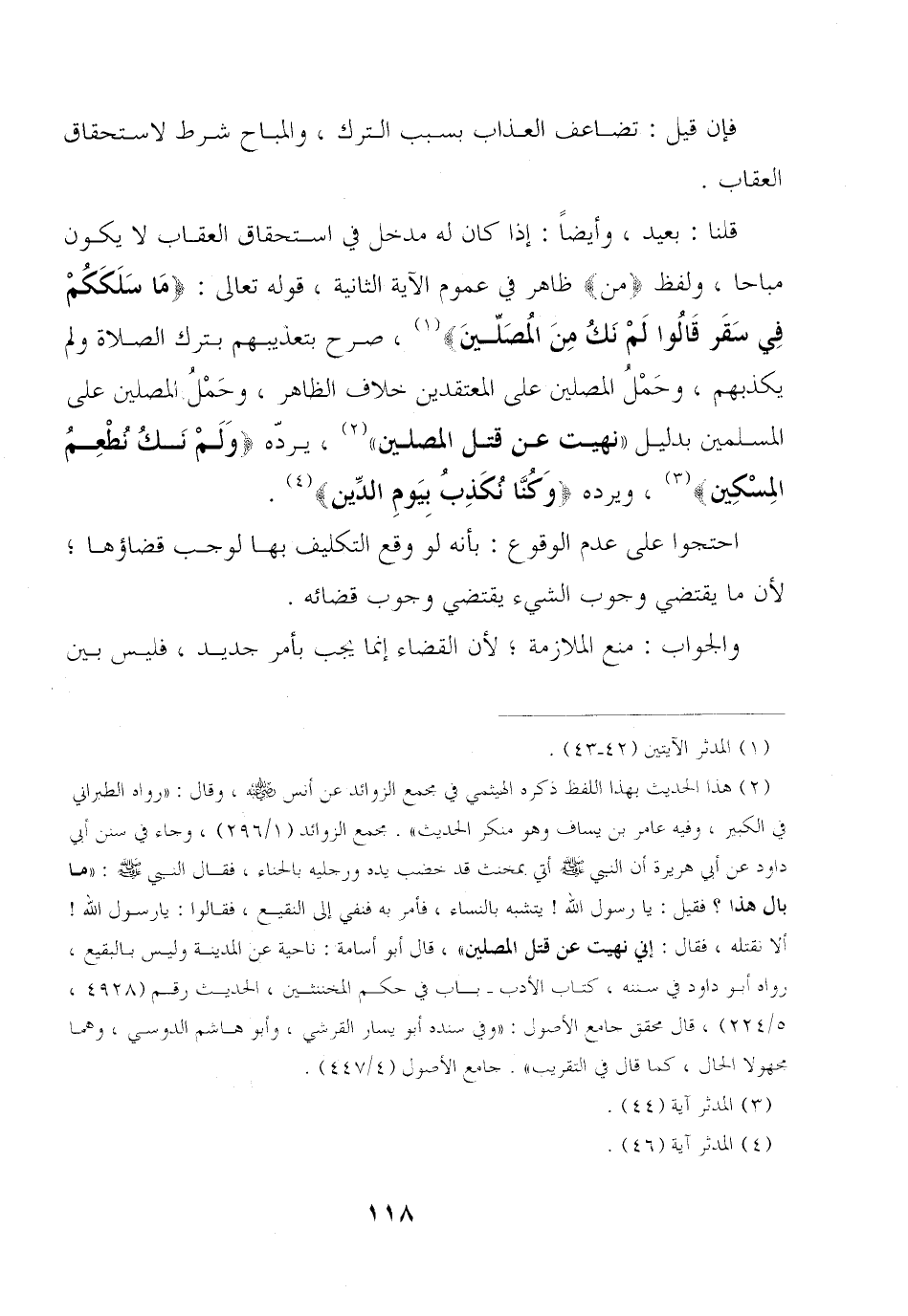 قلنا: بعيد, وأيضًا: إذا كان له مدخل في استحقاق العقاب لا يكون مباحا, ولفظ {من} ظاهر في عموم الآية الثانية, قوله تعالى: {ما سلككم في سقر قالوا لم نك من المصلين} , صرح بتعذيبهم بترك الصلاة ولم يكذبهم, وحمل المصلين على المعتقدين خلاف الظاهر, وحمل المصلين على المسلمين بدليل «نهيت عن قتل المصلين» , يردّه {ولم نك نطعم المسكين} , ويرده {وكنا نكذب بيوم الدين}.