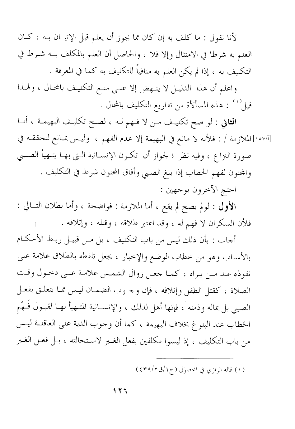 الثاني: لو صح تكليف من لا فهم له, لصح تكليف البهيمة, أما الملازمة: فلأنه لا مانع في البهيمة إلا عدم الفهم, وليس بمانع لتحققه في صورة النزاع, وفيه نظر؛ لجواز أن تكون الإنسانية التي بها يتهيأ الصبي والمجنون لفهم الخطاب إذا بلغ الصبي وأفاق المجنون شرط في التكليف.