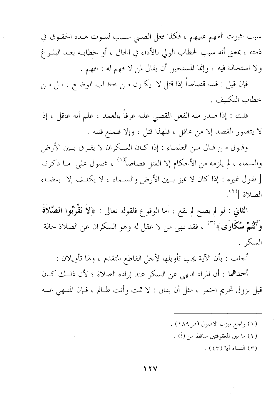 وقول من قال من العلماء: إذا كان السكران لا يفرق بين الأرض والسماء, لم يلزمه من الأحكام إلا القتل قصاصًا, محمول على ما ذكرنا [لقول غيره: إذا كان لا يميز بين الأرض والسماء, لا يكلف إلا بقضاء الصلاة].