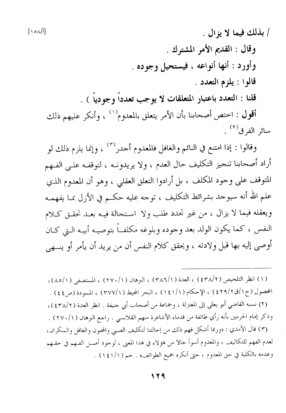 وقالوا: إذا امتنع في النائم والغافل فالمعدوم أجدر, وإنما يلزم ذلك لو أراد أصحابنا تنجيز التكليف حال العدم, ولا يريدونه, لتوقفه على الفهم المتوقف على وجود المكلف, بل أرادوا التعلق العقلي, وهو أن المعدوم الذي علم الله أنه سيوجد بشرائط التكليف, توجه عليه حكم في الأزل بما يفهمه ويعقله فيما لا يزال, من غير تجدد طلب ولا استحالة فيه بعد تحقق كلام النفس, كما يكون الولد بعد وجوده وبلوغه مكلفًا بتوصيه أبيه التي كان أوصى إليه بها قبل ولادته, ويحقق كلام النفس أن من يريد أن يأمر أو ينهى