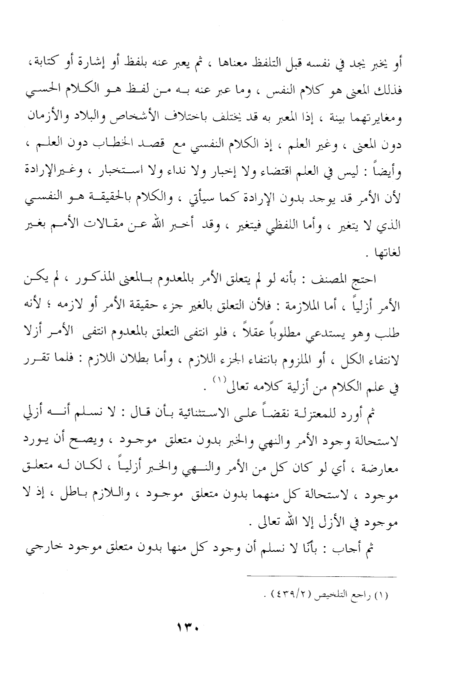 ثم أورد للمعتزلة نقضًا على الاستثنائية بأن قول: لا نسلم أنه أزلي لاستحالة وجود الأمر والنهي والخبر بدون متعلق موجود, ويصح أن يورد معارضة, أي لو كان كل من الأمر والنهي والخبر أزليًا, لكانا له متعلق موجود, لاستحالة كل منهما بدون متعلق موجود, واللازم باطل, إذ لا موجود في الأزل إلا الله تعالى.