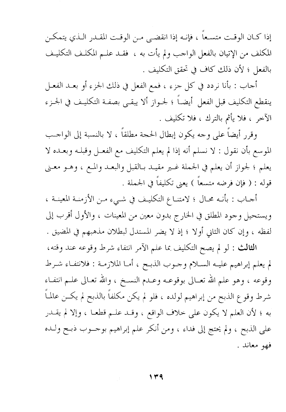 الثالث: لو لم يصح التكليف بما علم الآمر انتفاء شرط وقوعه عند وقته, لم يعلم إبراهيم عليه السلام وجوب الذبح, أما الملازمة: فلانتفاء شرط وقوعه, وهو علم الله تعالى بوقوعه وعدم النسخ, والله تعالى علم انتفاء شرط وقوع الذبح من إبراهيم لولده, فلو لم يكن مكلفًا بالذبح لم يكن عالمًا به؛ لأن العلم لا يكون على خلاف الواقع, وقد علم قطعا, وإلا لم يقدر على الذبح, ولم يحتج إلى فداء, ومن أنكر علم إبراهيم بوجوب ذبح ولده فهو معاند.
