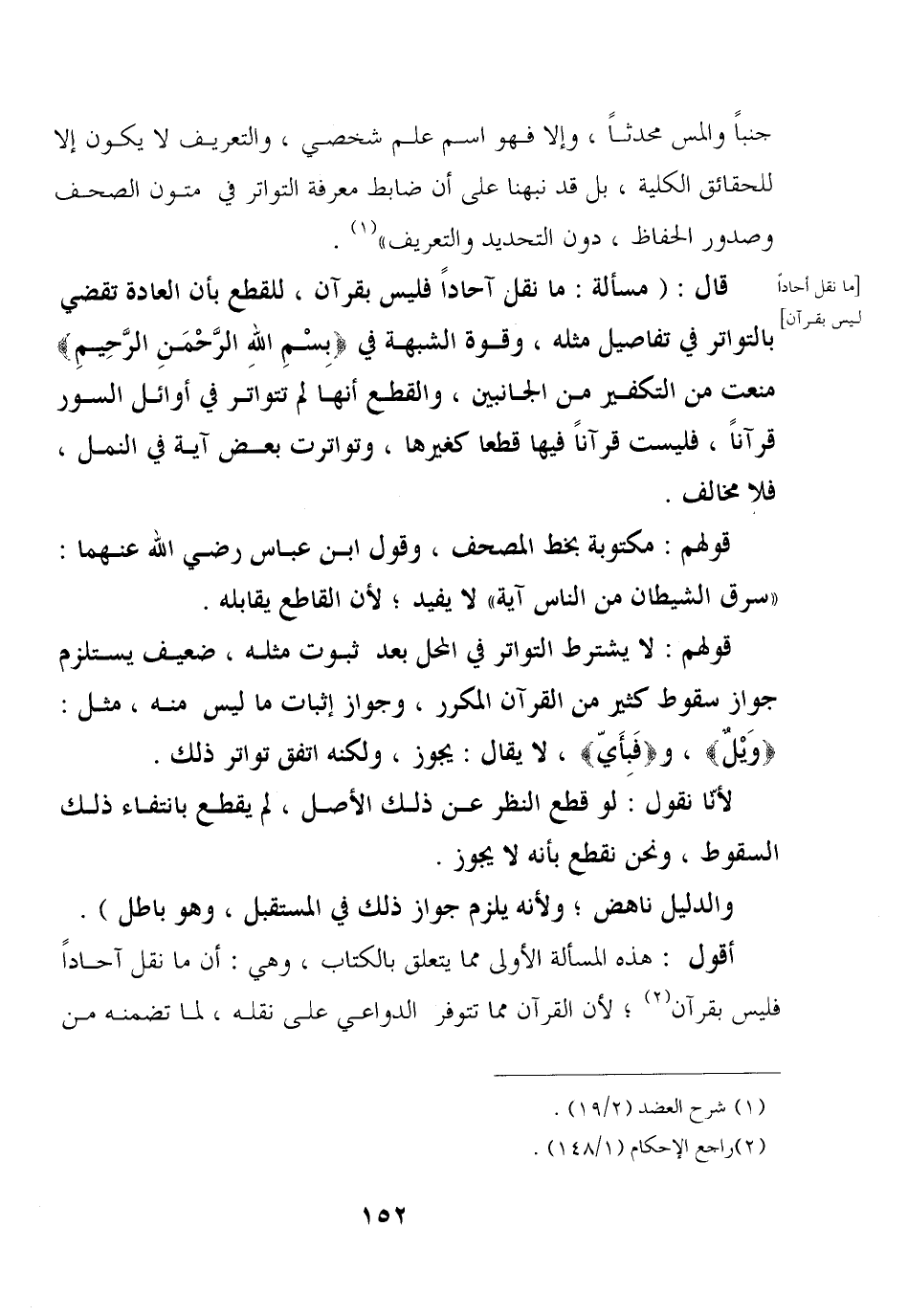 قال: (مسألة: ما نقل آحادًا فليس بقرآن, للقطع بأن العادة تقضي بالتواتر في تفاصيل مثله, وقوة الشبهة في {بسم الله الرحمن الرحيم} منعت من التكفير من الجانبي, والقطع أنها لم تتواتر في أوائل السور قرآنًا, فليست قرآنًا فيها قطعا كغيرها, وتواترت بعض آية في النمل, فلا مخالف.