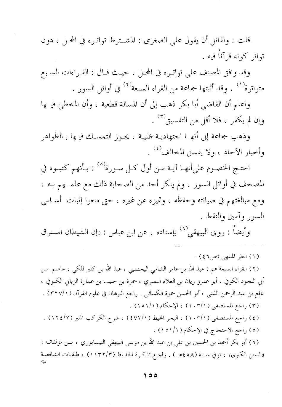 وقد وافق المصنف على تواتره في المحل, حيث قال: القراءات السبع متواترة, وقد أثبتها جماعة من القراء السبعة في أوائل السور.
