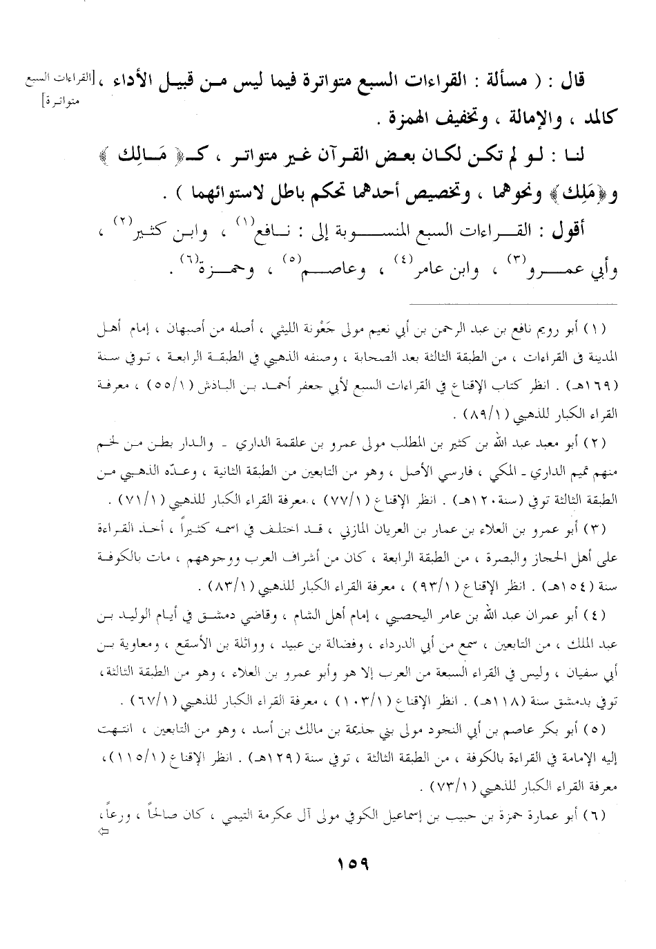قال: (مسألة: القراءات السبع متواترة فيما ليس من قبيل الأداء, كالمد, والإمالة, وتخفيف الهمزة.