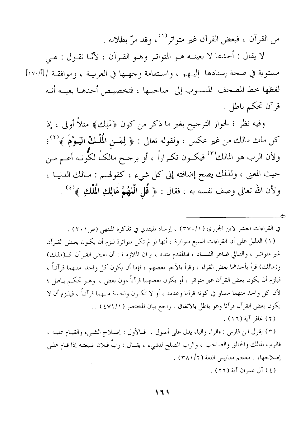 لا يقال: أحدها لا بعينه هو المتواتر وهو القرآن, لأنّا نقول: هي مستوية في صحة إسنادها إليهم, واستقامة وجهها في العربية, وموافقة لفظها خط المصحف المنسوب إلى صاحبها, فتخصيص أحدها بعينه أنه قرآن تحكم باطل.