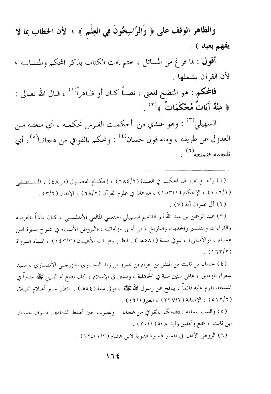السهيلي: وهو عندي من أحكمت الفرس تحكمه, أي منعته من العدول عن طريقه, ومنه قول حسان: ونحكم بالقوافي من هجانا, أي نلجمه فنمنعه.