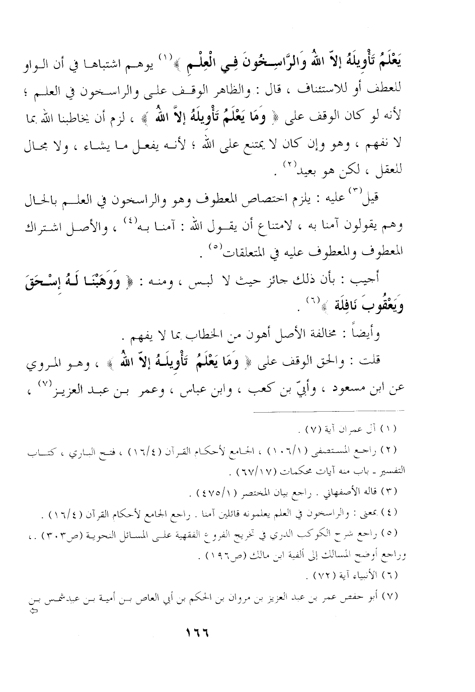يعلم تأويله إلا الله والراسخون في العلم} يوهم اشتباها في أن الواو للعطف أو للاستئناف, قال: والظاهر الوقف على والراسخون في العلم؛ لأنه لو كان الوقف على {وما يعلم تأويله إلا الله} , لزم أن يخاطبنا الله بما لا نفهم, وهو وإن كان لا يمتنع على الله؛ لأنه يفعل ما يشاء, ولا مجال للعقل, لكن هو بعيد.