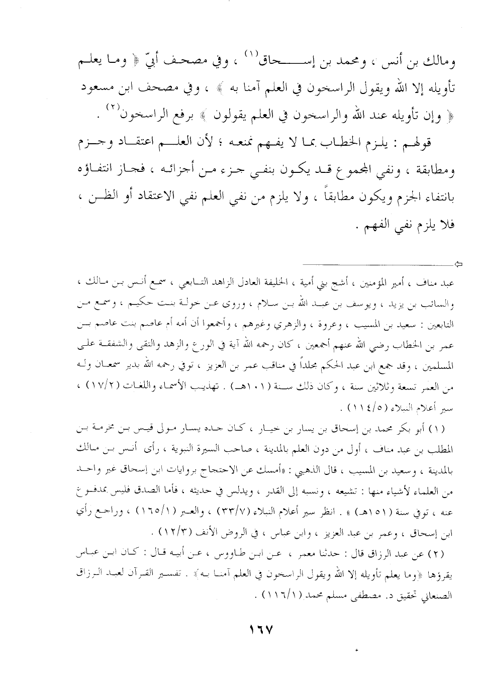 ومالك بن أنس, ومحمد بن إسحاق, وفي مصحف أبيّ {وما يعلم تأويله إلا الله ويقول الراسخون في العلم آمنا به} , وفي مصحف ابن مسعود {وإن تأويله عند الله والراسخون في العلم يقولون} برفع الراسخون.