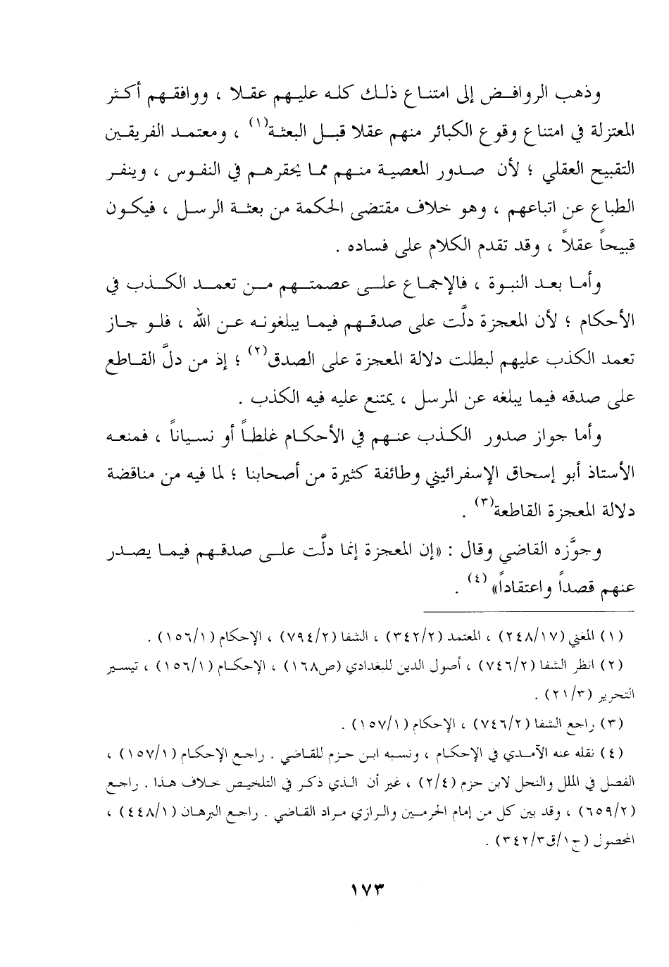 وذهب الروافض إلى امتناع ذلك كله عليهم عقلا, ووافقهم أكثر المعتزلة في امتناع وقوع الكبائر منهم عقلا قبل البعثة, ومعتمد الفريقين التقبيح العقلي؛ لأن صدور المعصية منهم مما يحقرهم في النفوس, وينفر الطباع عن اتباعهم, وهو خلاف مقتضى الحكمة من بعثة الرسل, فيكون قبيحًا عقلًا, وقد تقدم الكلام على فساده.