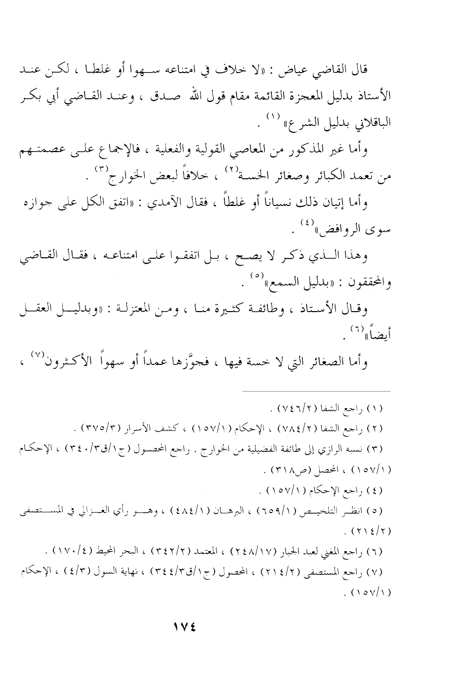 قال القاضي عياض: «لا خلاف في امتناعه سهوا أو غلطا, لكن عند الأستاذ بدليل المعجزة القائمة مقام قول الله صدق, وعند القاضي أبي بكر الباقلاني بدليل الشرع».