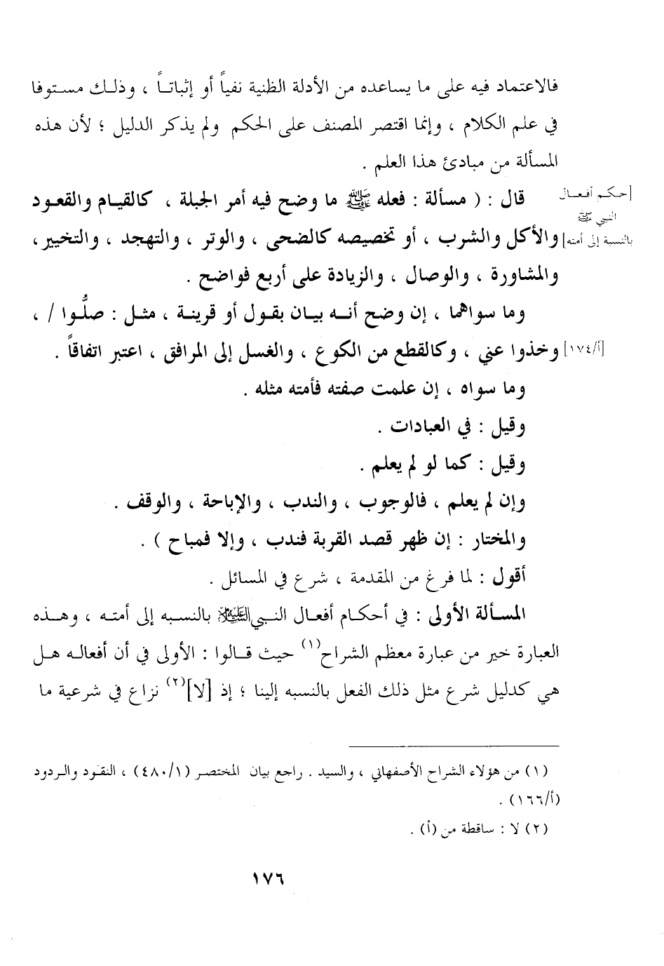 المسألة الأولى: في أحكام أفعال النبي عليه السلام بالنسبة إلى أمته, وهذه العبارة خير من عبارة معظم الشراح حيث قالوا: الأولى في أن أفعاله هل هي كدليل شرع مثل ذلك الفعل بالنسبة إلينا؛ إذ [لا] نزاع في شرعية ما
