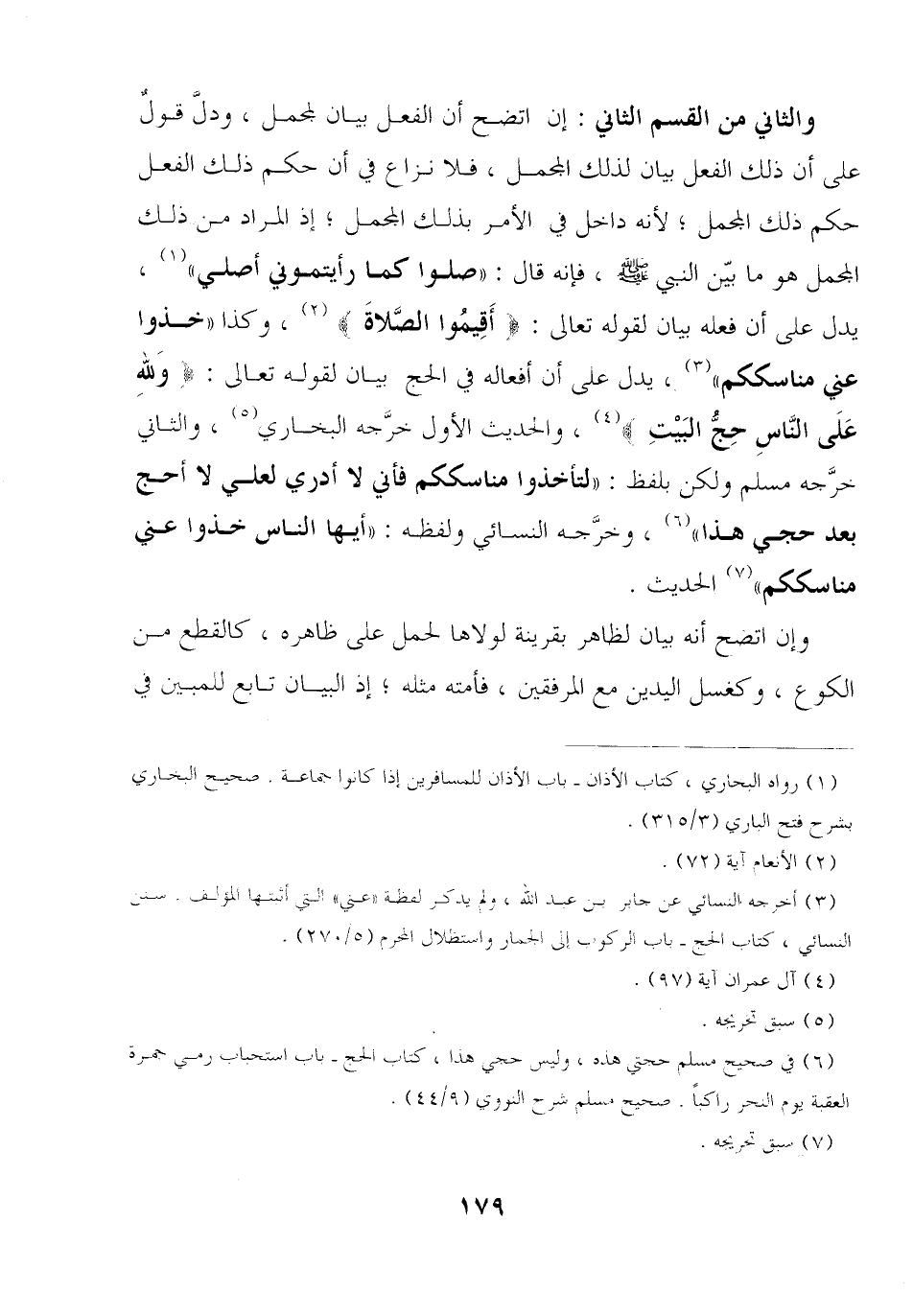 والثاني من القسم الثاني: إن اتضح أن الفعل بيان لمجمل, ودلَّ قولٌ على أن ذلك الفعل بيان لذلك المجمل, فلا نزاع في أن حكم ذلك الفعل حكم ذلك المجمل؛ لأنه داخل في الأمر بذلك المجمل؛ إذ المراد من ذلك المجمل هو ما بيّن النبي صلى الله عليه وسلم, فإنه قال: «صلوا كما رأيتموني أصلي» , يدل على أن فعله بيان لقوله تعالى: {أقيمُوا الصَّلاةَ} , وكذا «خذوا عني مناسككم» , يدل على أن أفعاله في الحج بيان لقوله تعالى: {ولله على الناس حج البيت} , والحديث الأول خرَّجه البخاري, والثاني خرَّجه مسلم ولكن بلفظ: «لتأخذوا مناسككم فأني لا أدري لعلي لا أحد بعد حجي هذا» , وخرَّجه النسائي ولفظه: «أيها الناس خذوا عني مناسككم» الحديث.