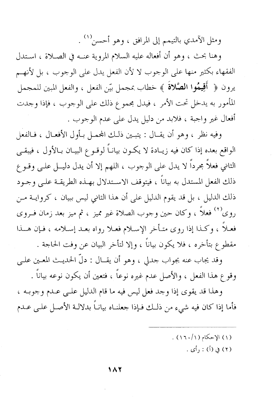 وفيه نظر, وهو أن يقال: يتبين ذلك المجمل بأول الأفعال, فالفعل الواقع بعده إذا كان فيه زيادة لا يكون بيانًا لوقوع البيان بالأول, فيبقى الثاني فعلًا مجردًا لا يدل على الوجوب, اللهم إلا أن يدل دليل على وقوع ذلك الفعل المستدل به بيانًا, فيتوقف الاستدلال بهذه الطريقة على وجود ذلك الدليل, بل قد يقوم الدليل على أن هذا الثاني ليس ببيان, كرواية من روى فعلًا, وكان حين وجوب الصلاة غير مميز, ثم ميز بعد زمان فروى فعلًا, وكذا إذا روى متأخر الإسلام فعلا رواه بعد إسلامه, فإن هذا مقطوع بتأخره, فلا يكون بيانًا, وإلا لتأخر البيان عن وقت الحاجة.