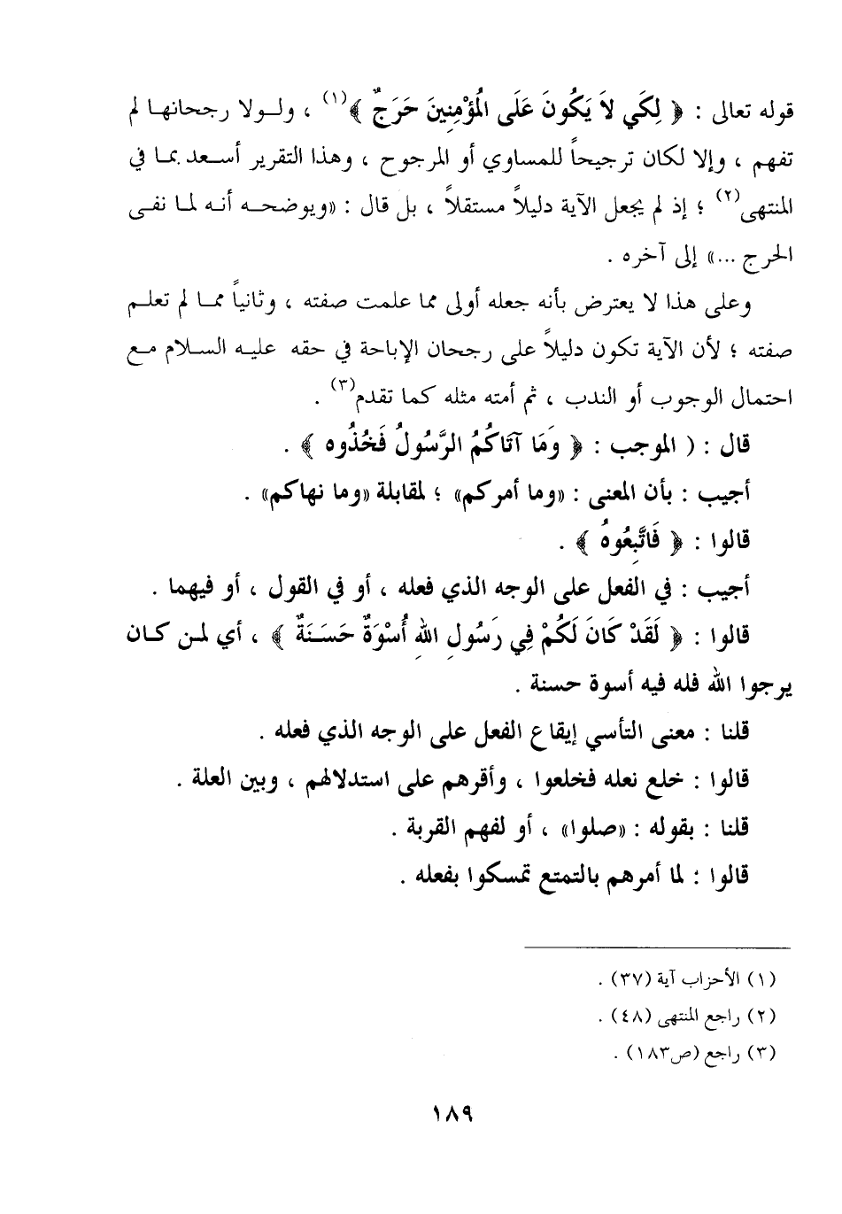 قوله تعالى: {لكي لا يكون على المؤمنين حرج} , ولولا رجحانها لم تفهم, وإلا لكان ترجيحًا للمساوي أو المرجوح, وهذا التقرير أسعد بما في المنتهى؛ إذ لم يجعل الآية دليلًا مستقلًا, بل قال: «ويوضحه أنه لما نفى الحرج ... » إلى آخره.