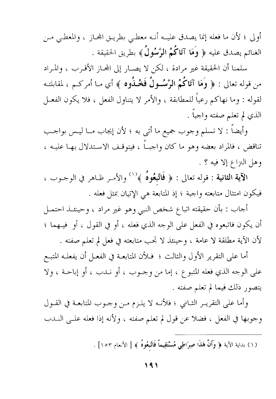 الآية الثانية: قوله تعالى: {فاتبعوه} والأمر ظاهر في الوجوب, فيكون امتثال متابعته واجبة؛ إذ المتابعة هي الإتيان بمثل فعله.