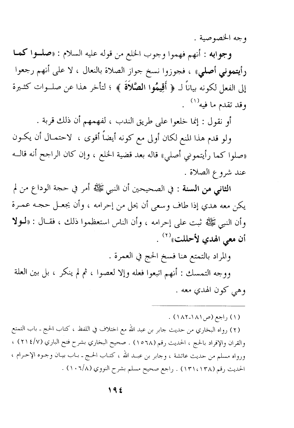 وجوابه: أنهم فهموا وجوب الخلع من قوله عليه السلام: «صلوا كما رأيتموني أصلي» , فجوزوا نسخ جواز الصلاة بالنعال, لا على أنهم رجعوا إلى الفعل لكونه بيانًا لـ {أقيموا الصلاة}؛ لتأخر هذا عن صلوات كثيرة وقد تقدم ما فيه.