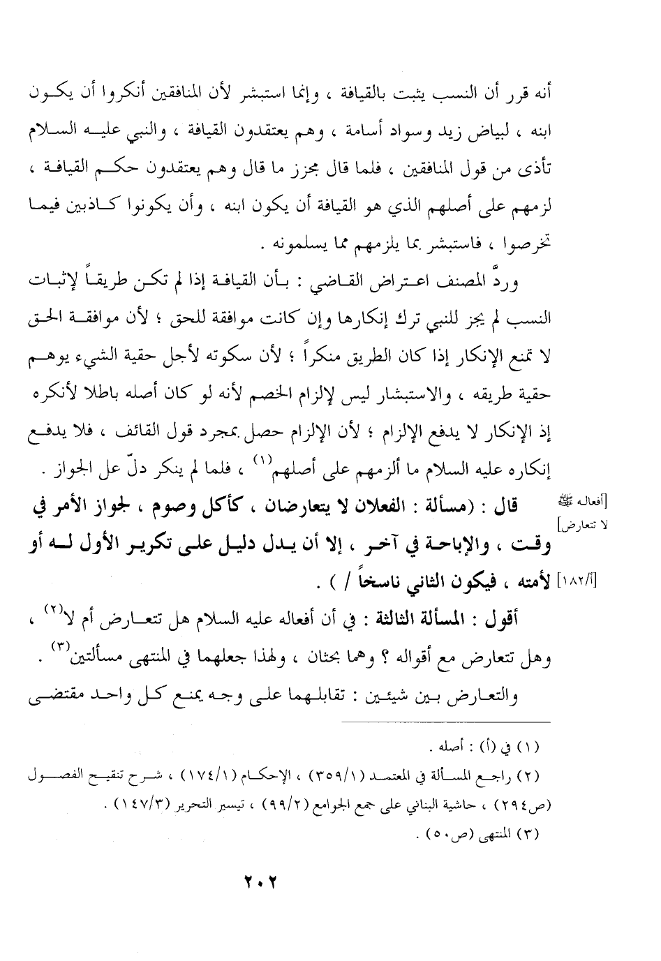 أقول: المسألة الثالثة: في أن أفعاله عليه السلام هل تتعارض أم لا, وهل تتعارض مع أقواله؟ وهما بحثان, ولهذا جعلهما في المنتهى مسألتين.