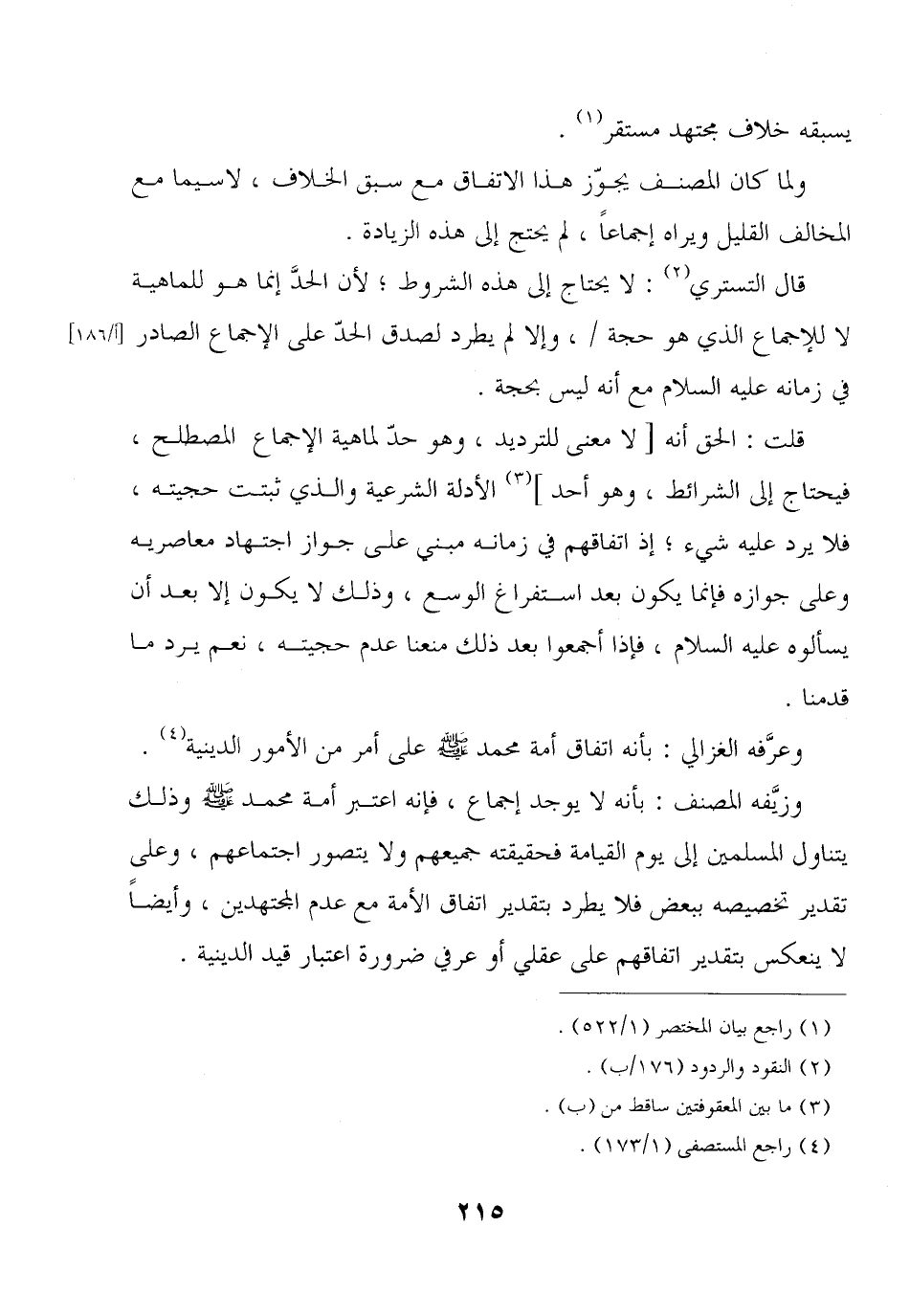قال التستري: لا يحتاج إلى هذه الشروط؛ لأن الحدَّ إنما هو للماهية لا للإجماع الذي هو حجة, وإلا لم يطرد لصدق الحدّ على الإجماع الصادر في زمانه عليه السلام مع أنه ليس بحجة.